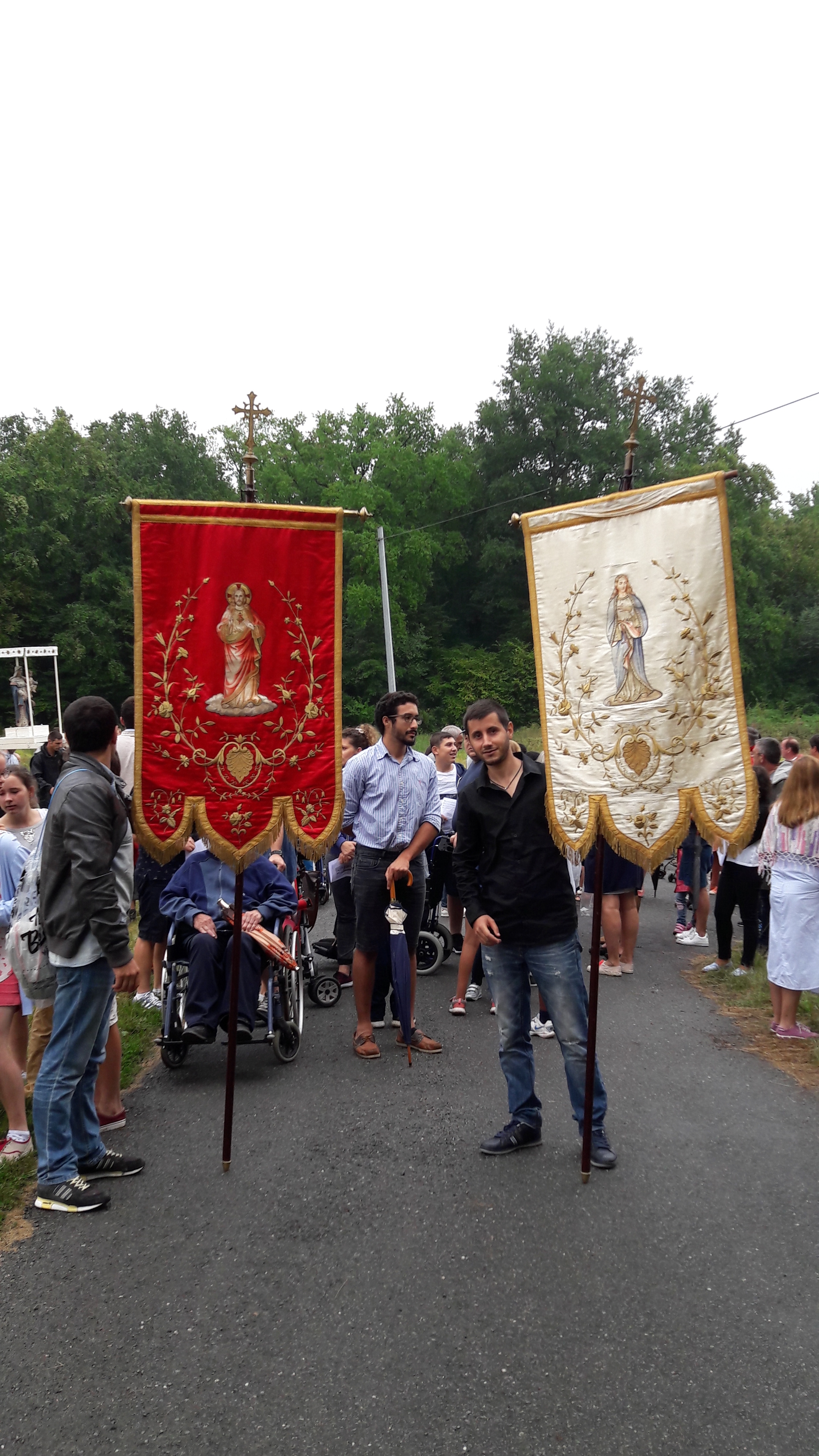 A 9h15 c’est au son du « Salve Regina » que les pèlerins prirent la route à la suite de la statue de Notre-Dame de Bonne-Nouvelle, elle-même précédée par les bannières qui ouvraient la marche. Comme de coutume en fin de marche, deux prêtres, le Père Christophe et le Père Pavel SYSSOEV, se tenaient à disposition pour recevoir les confessions.