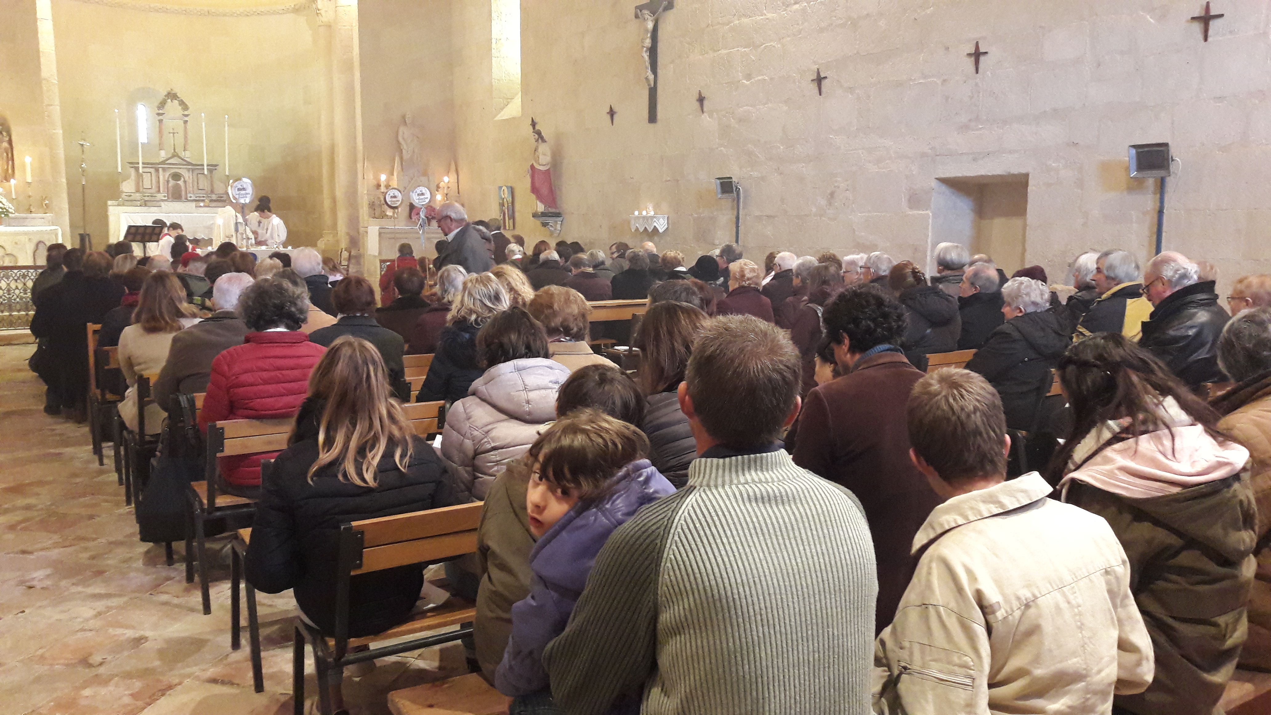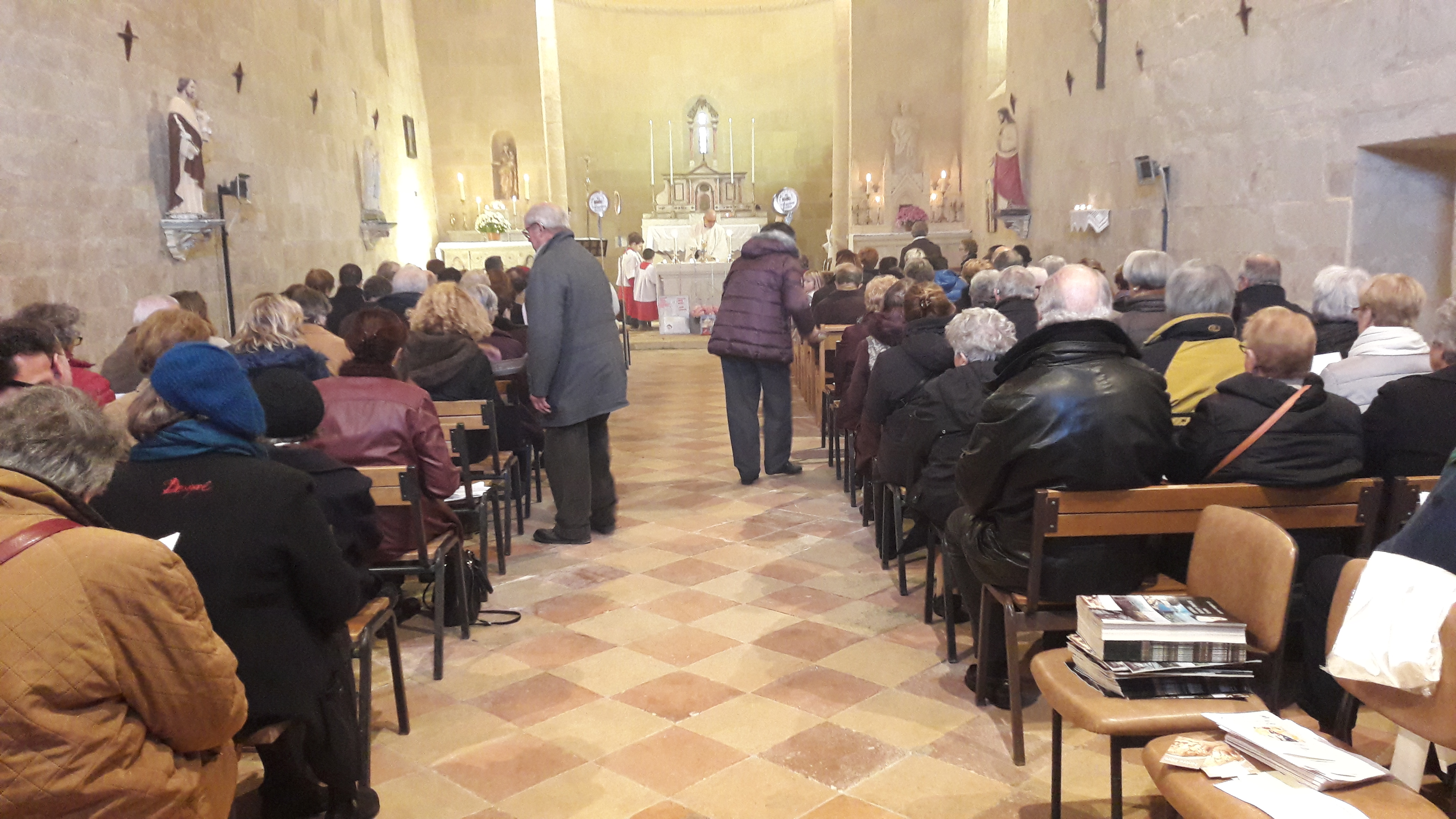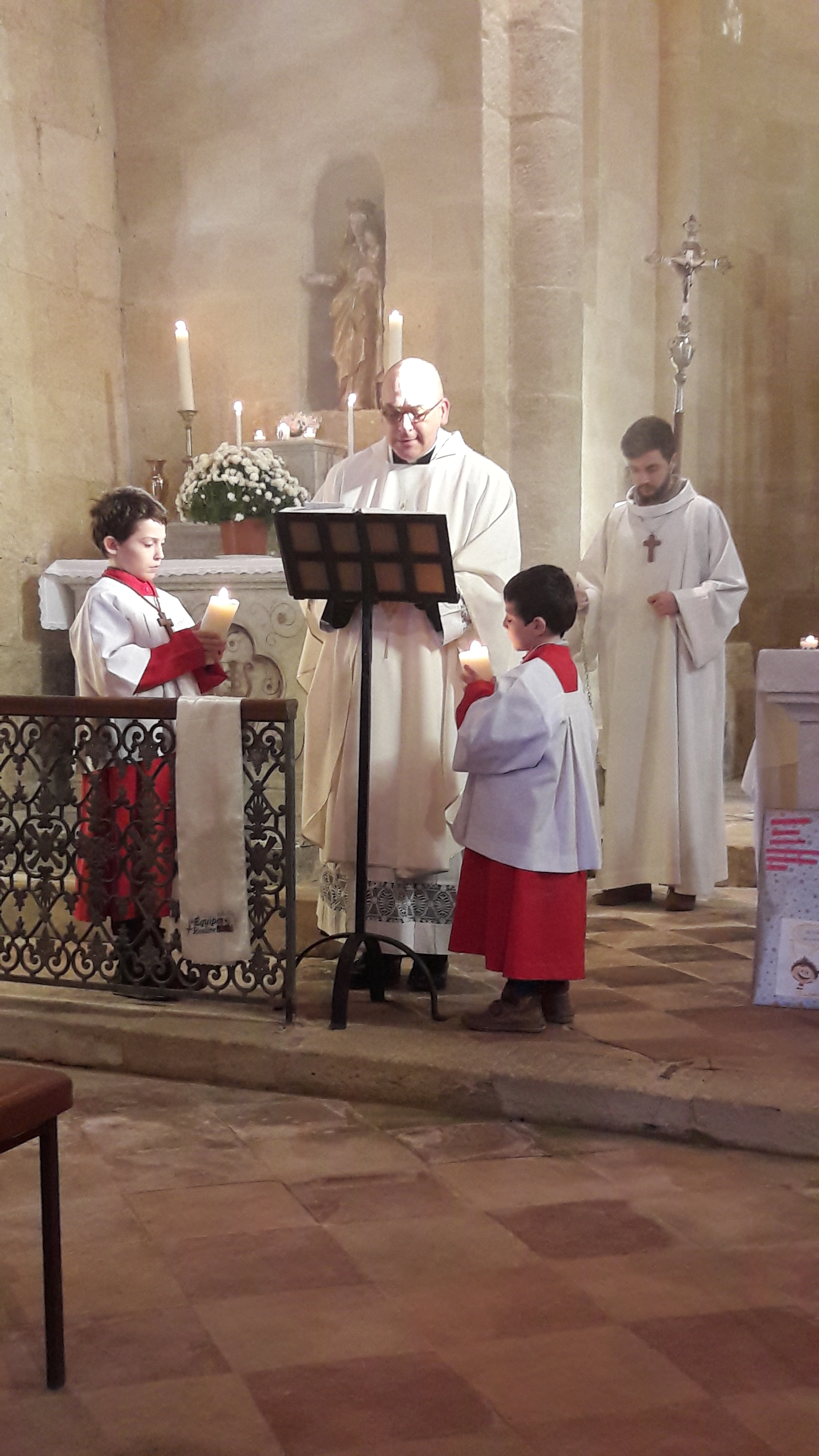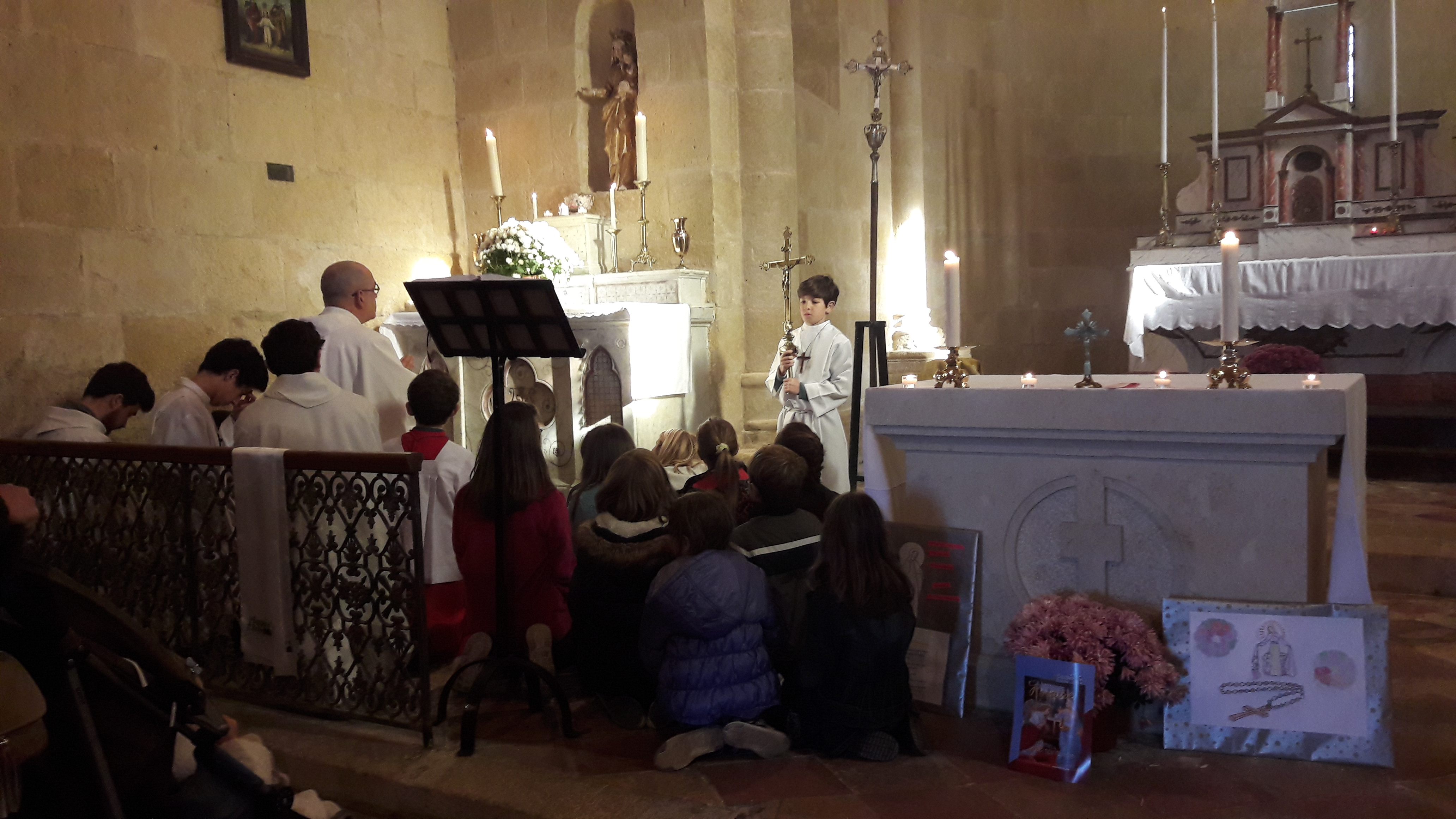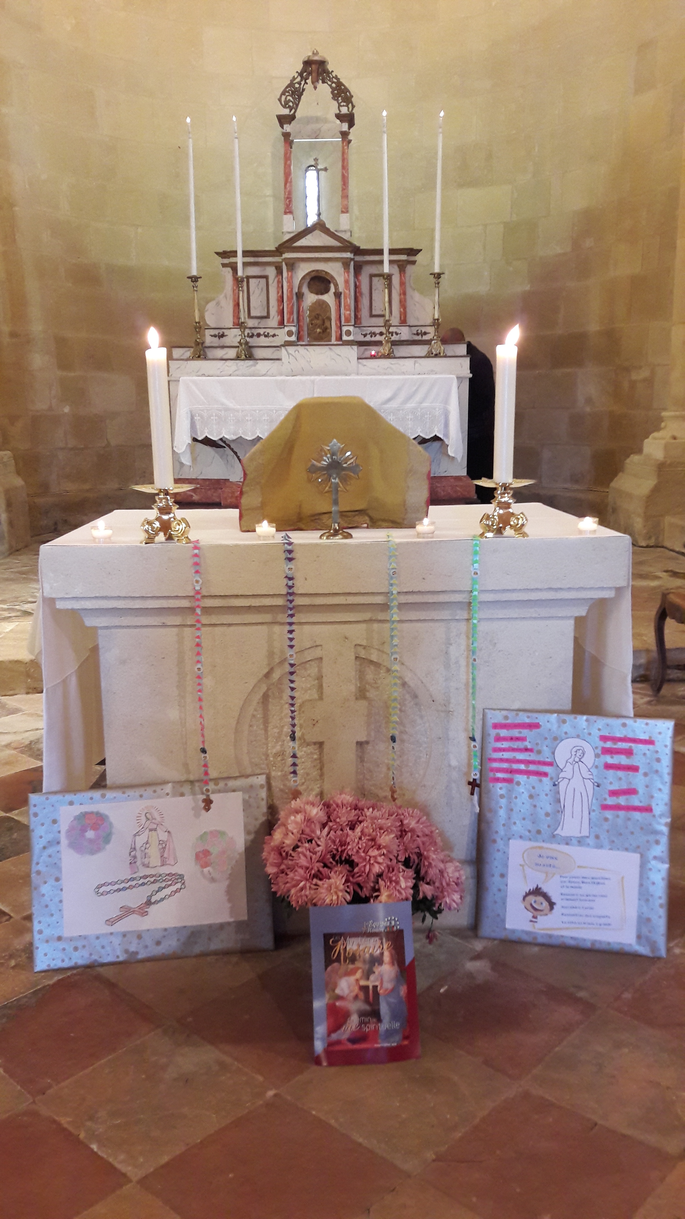 Au début de la messe animée également par les Équipes du Rosaire, les enfants du catéchisme ont apporté en procession des chapelets en feutrine offerts à chaque Équipe de notre secteur pastoral. C’était la Fête du Christ Roi de l’Univers, qui marque la fin de l’Année liturgique : un nouvel An donc à se souhaiter, avec « la joie d’être sauvé », un message imprimé sur un ruban de différente couleur remis et attaché sur le poignet de chaque participant. L’homélie a mis l’accent sur la place de Marie unie aux mystères du Christ dans le cycle liturgique. Une peinture de St Pierre offerte à l’église de Martres, dédiée à l’Apôtre, a été béni.