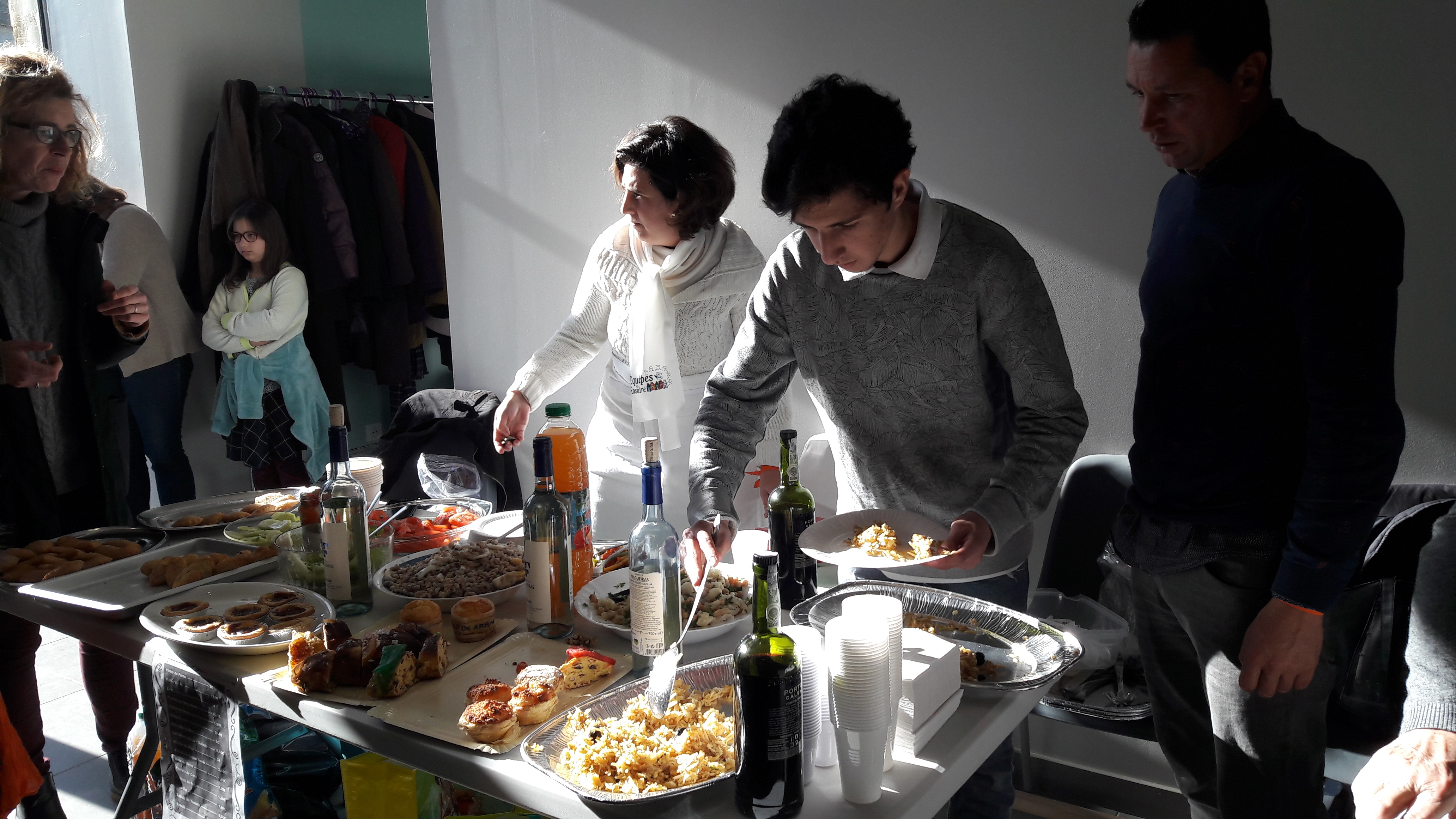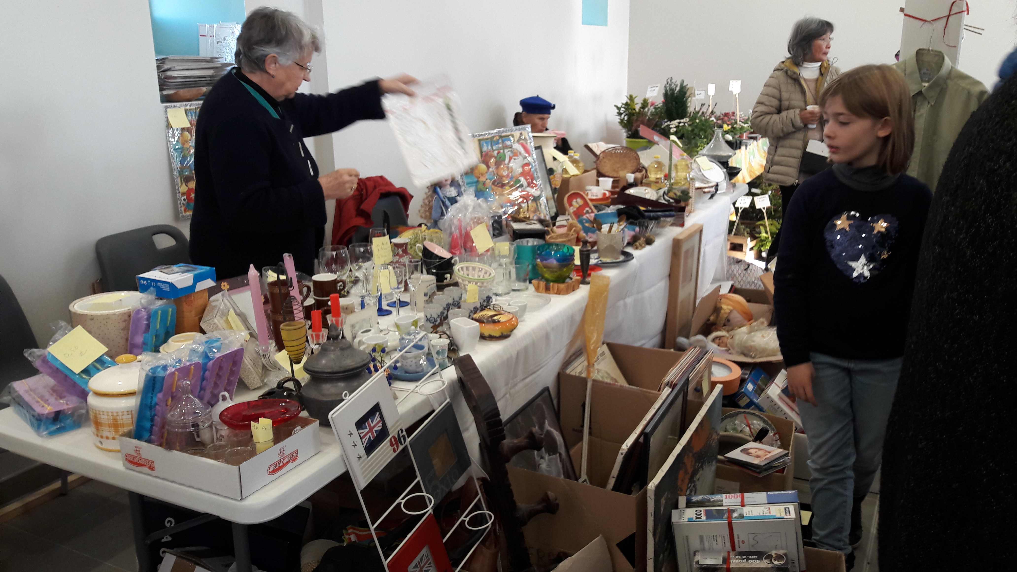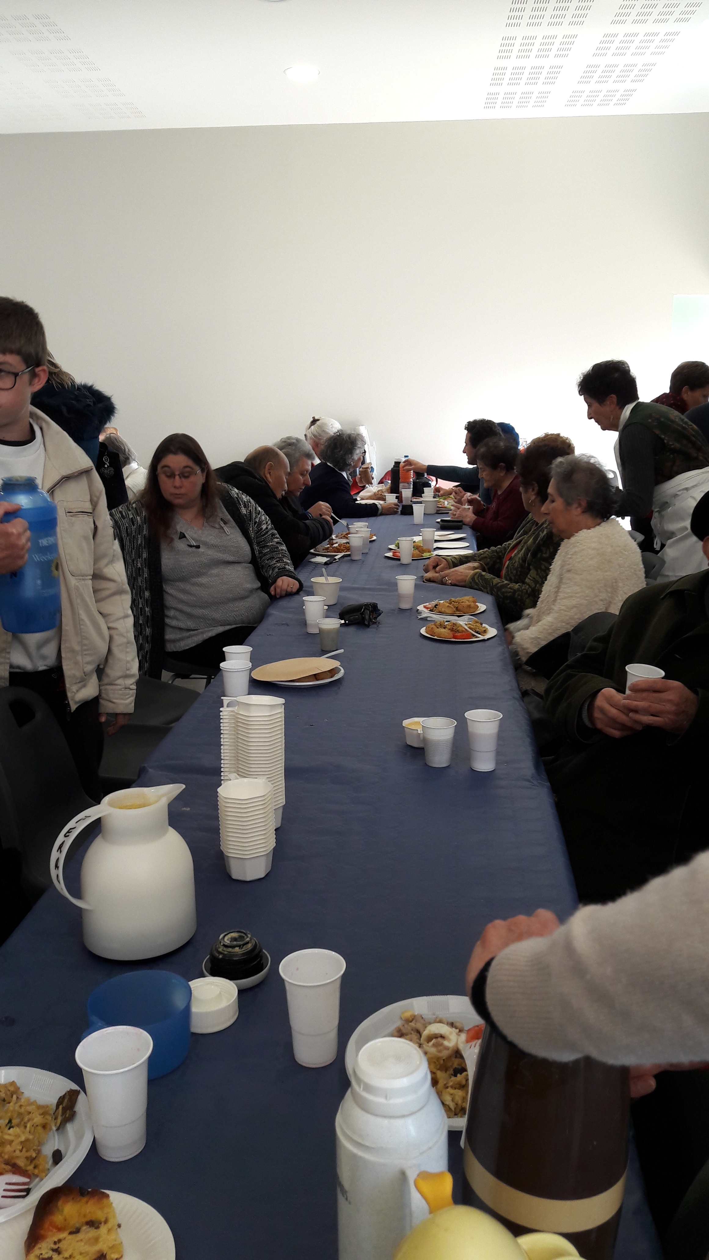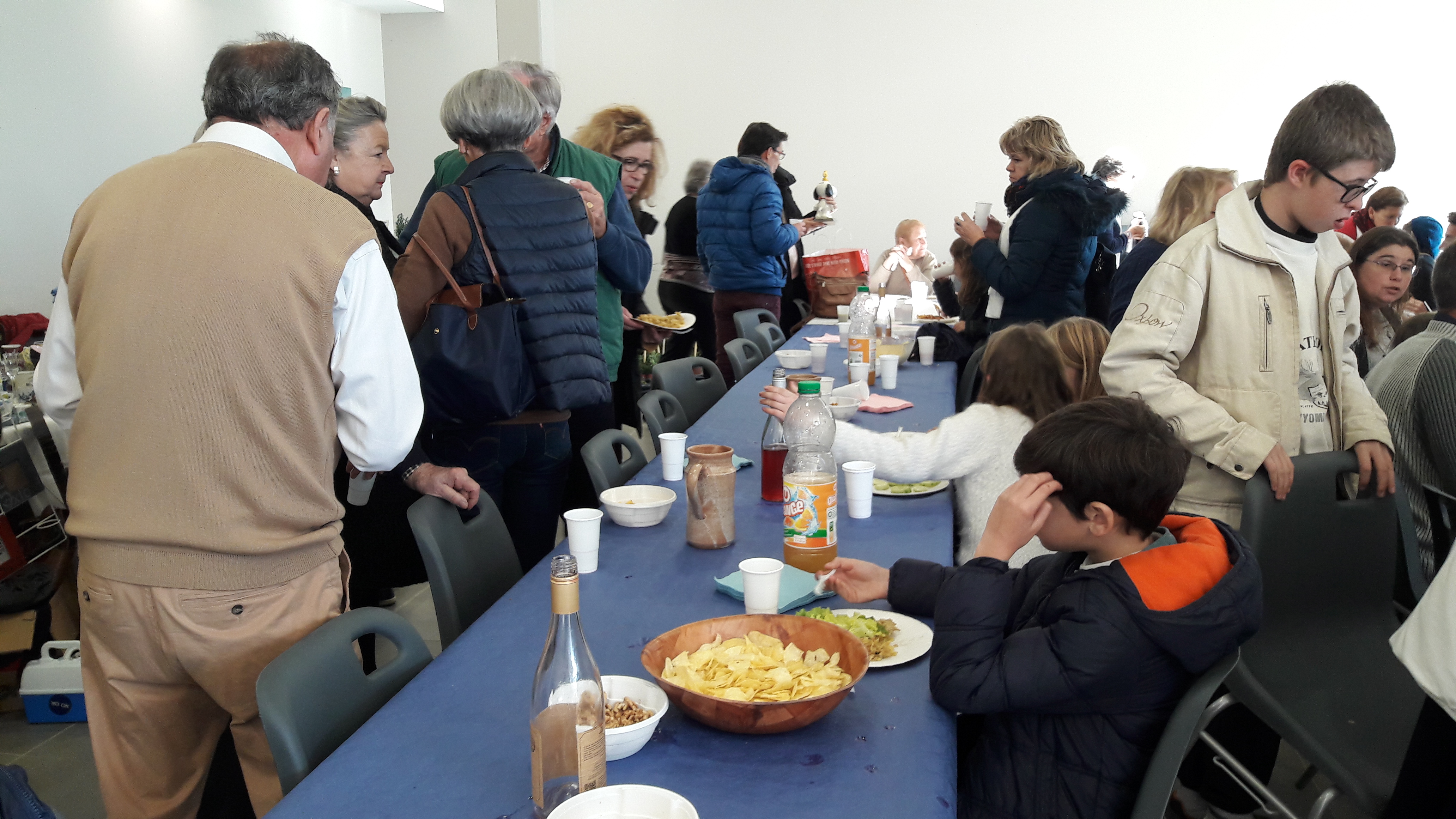 Dans la salle des fêtes, Madame le Maire, Mme RAYNE nous a généreusement ouvert ses portes pour l’apéritif offert par le relais pastoral de Gornac ; des soupes ont été offertes par « les tabliers blancs » ; des stands présentaient leur produits divers à la vente au profit de la paroisse, occasion de préparer des cadeaux de fin d’année. Resto’Roul a fait face à une file d’attente pour la restauration, tandis que d’autres achetaient des produits cuisinés portugais, des desserts en complément de leur pique nique.