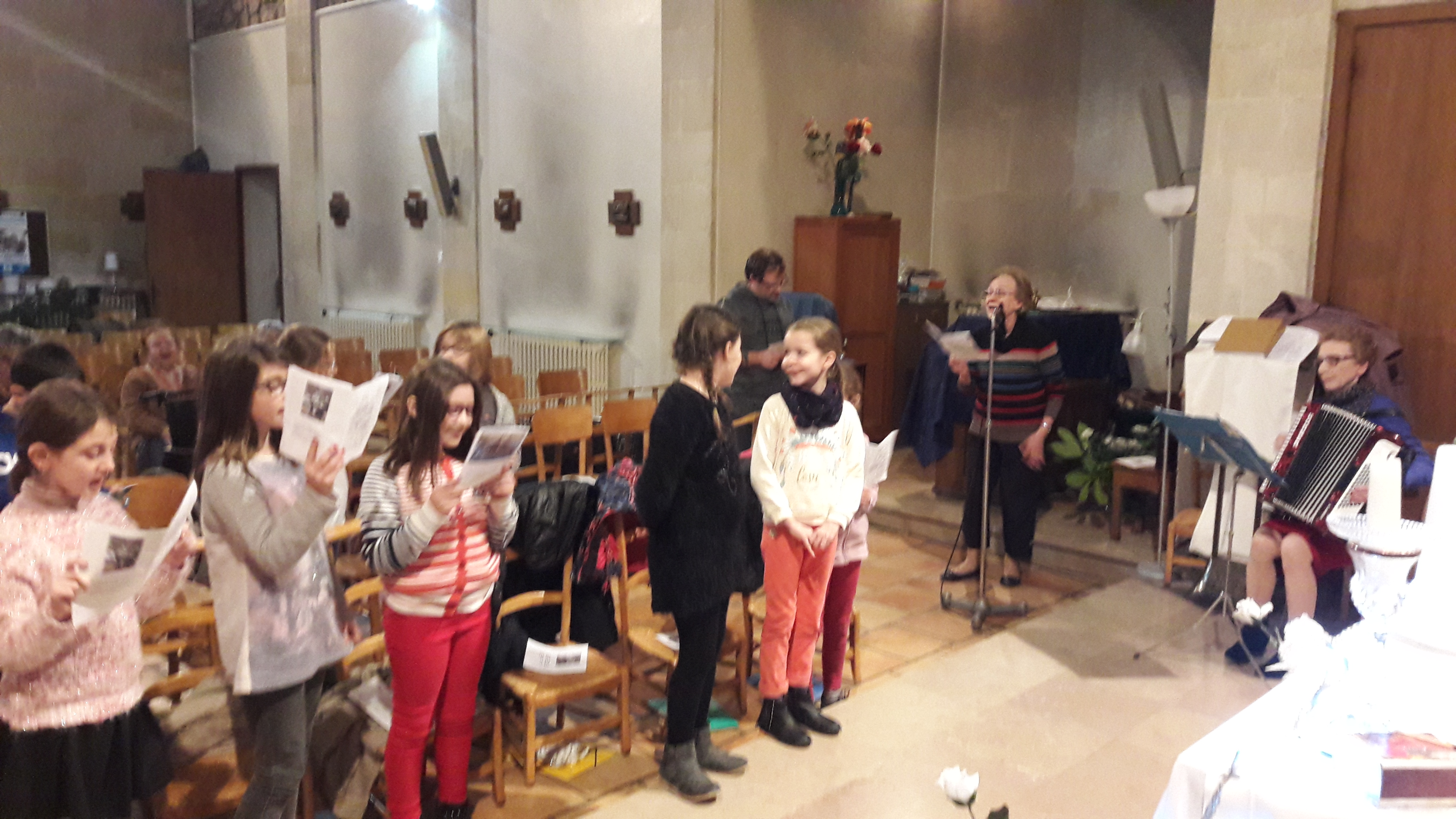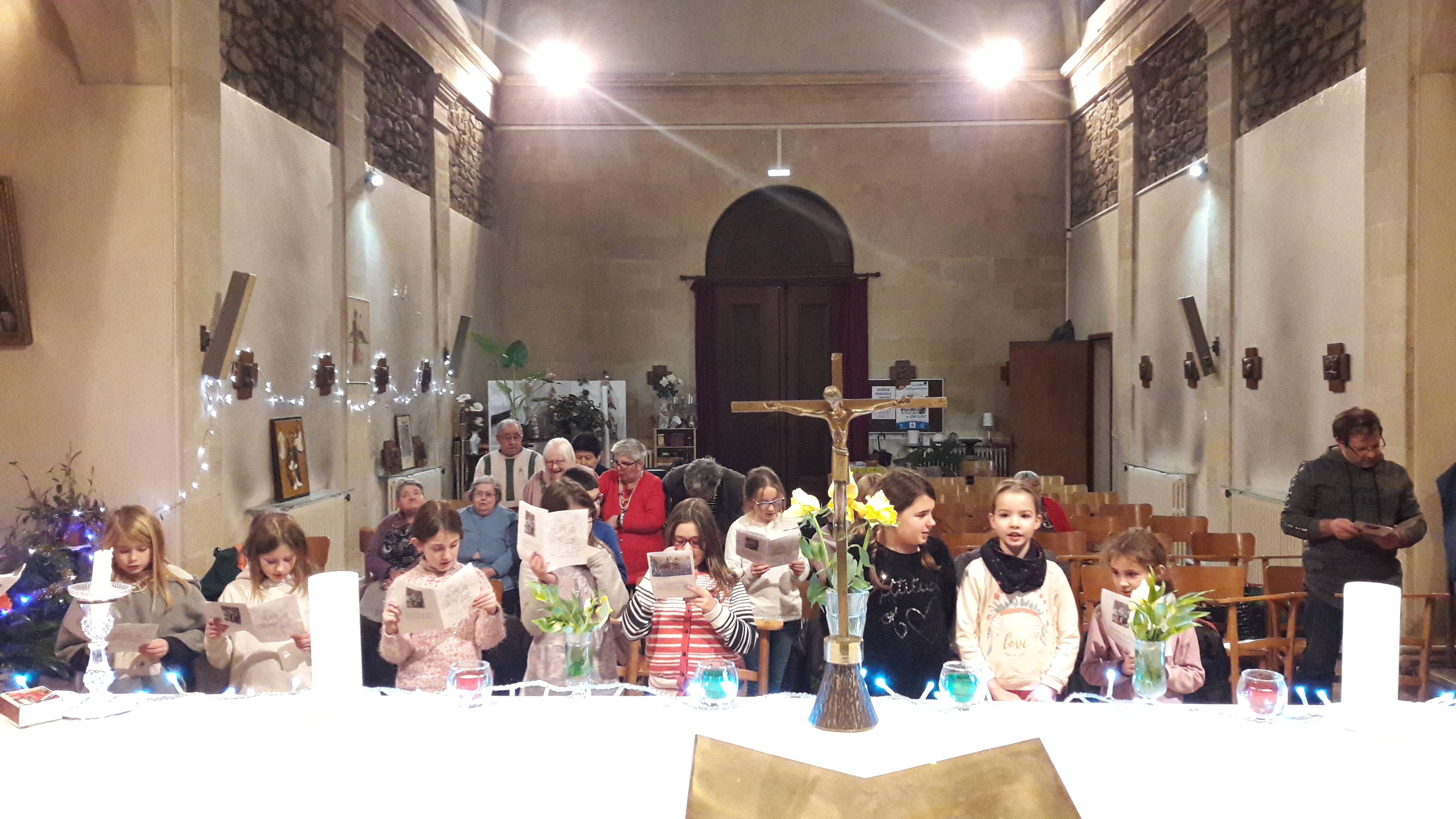 L’Évangile en saint Matthieu étant le fil conducteur de cette célébration joyeuse : madame de Meyer en pro. accompagnant les chants de ses doigts agiles sur l’accordéon et Martine Lagrange entraînant les enfants pour chanter « vive le vent » la « marche des rois »-« Jérusalem chante et danse pour ton Dieu « et « En lui vient reconnaître ton Dieu ton Sauveur ».
