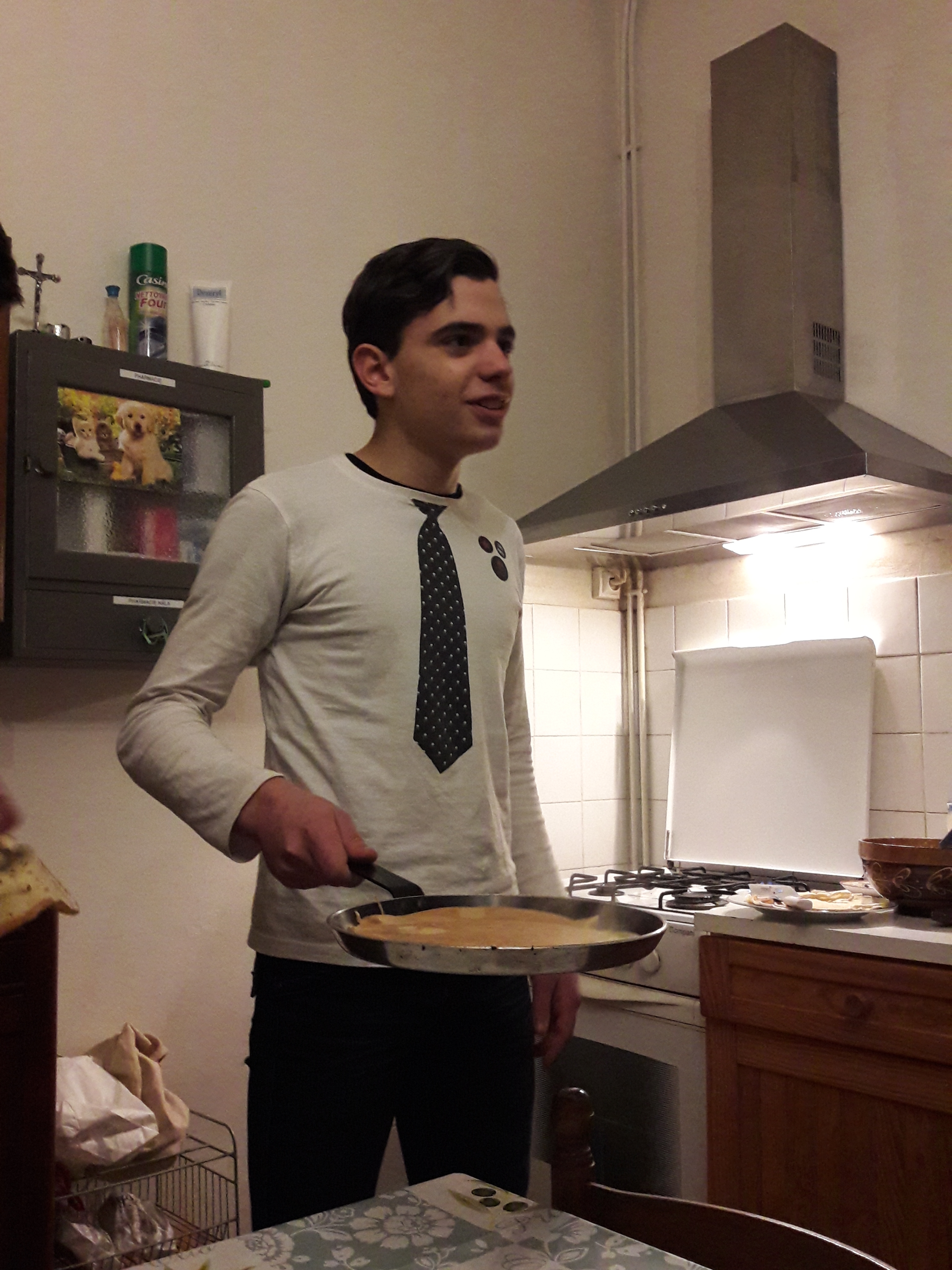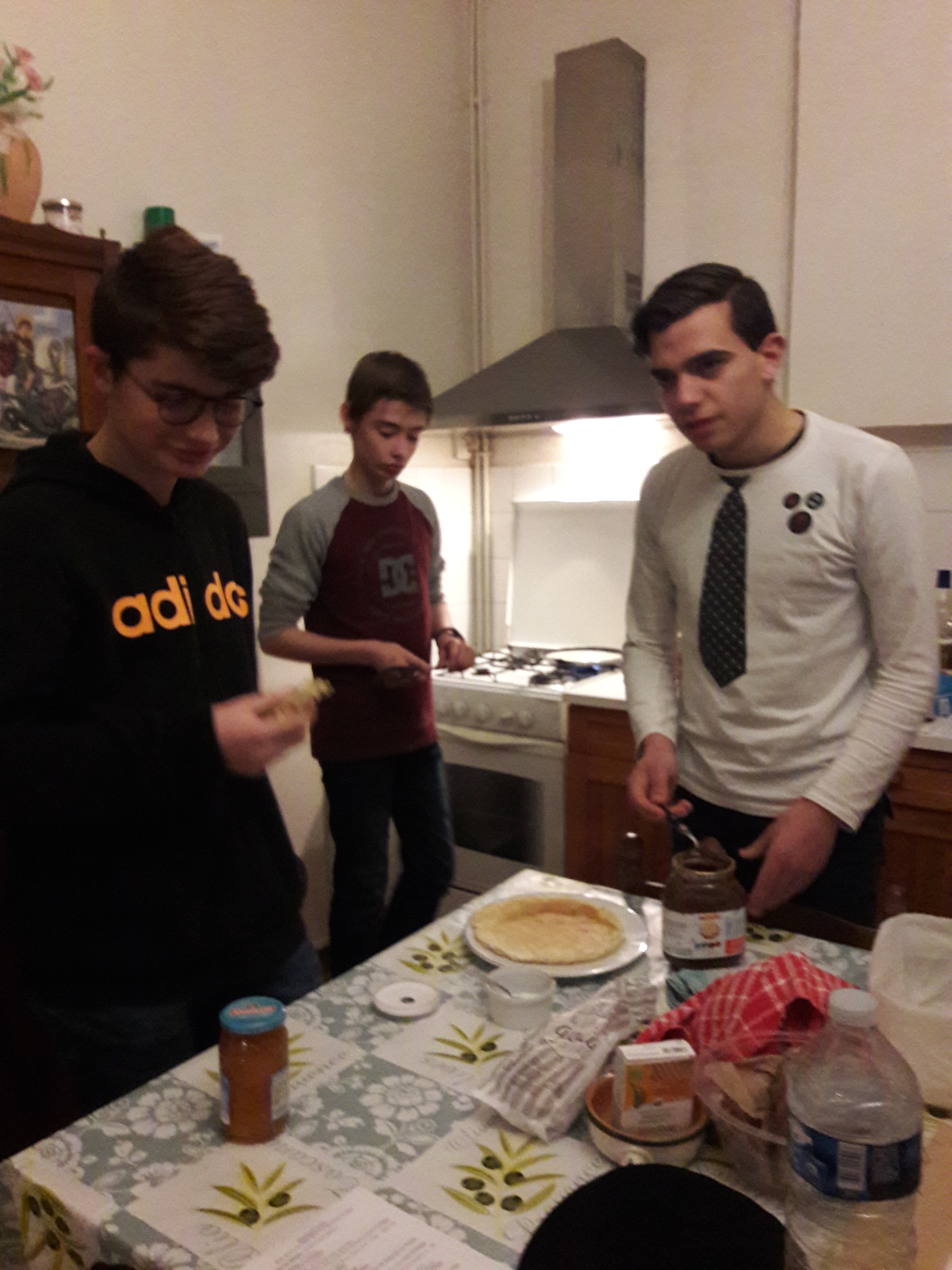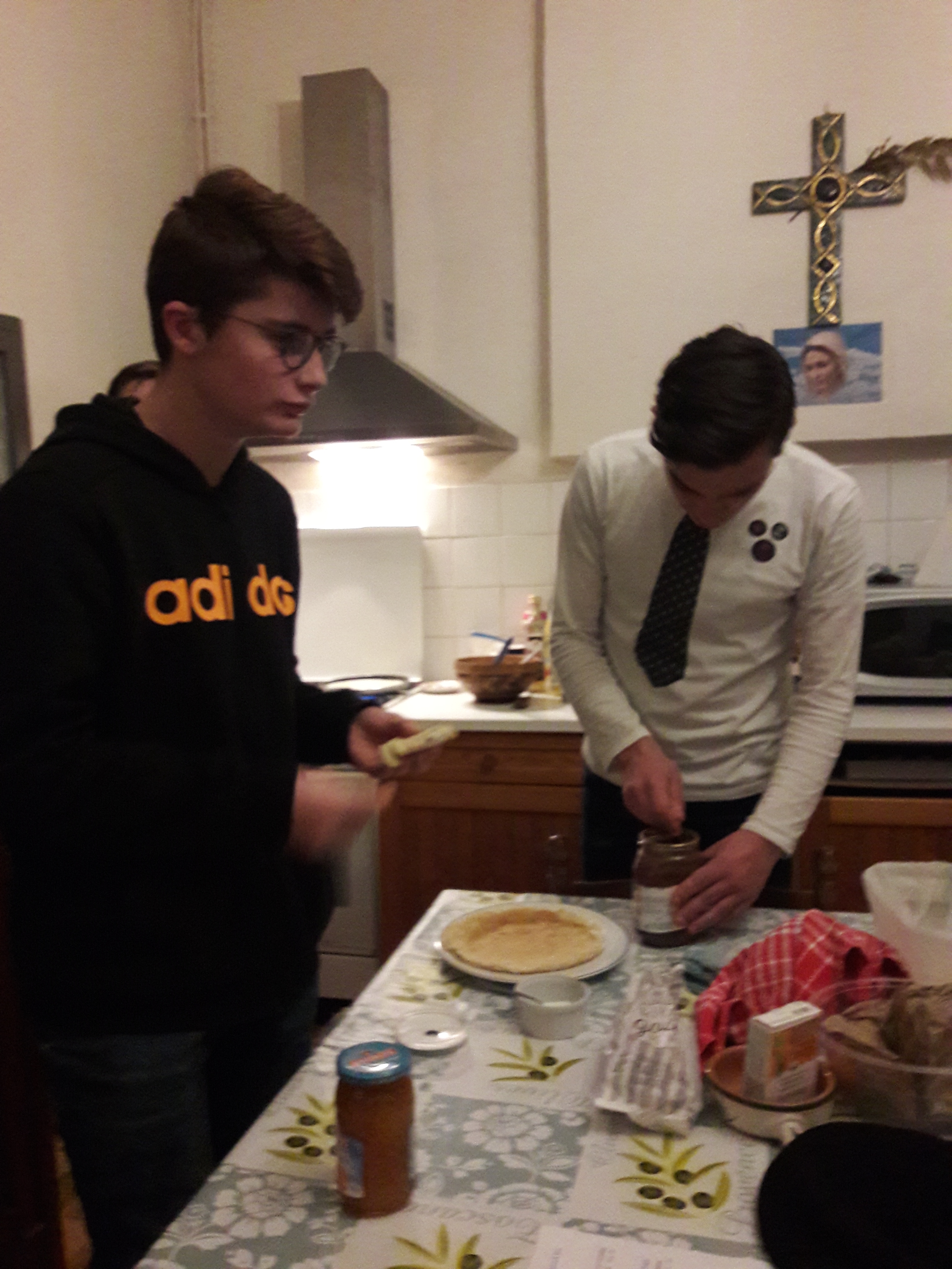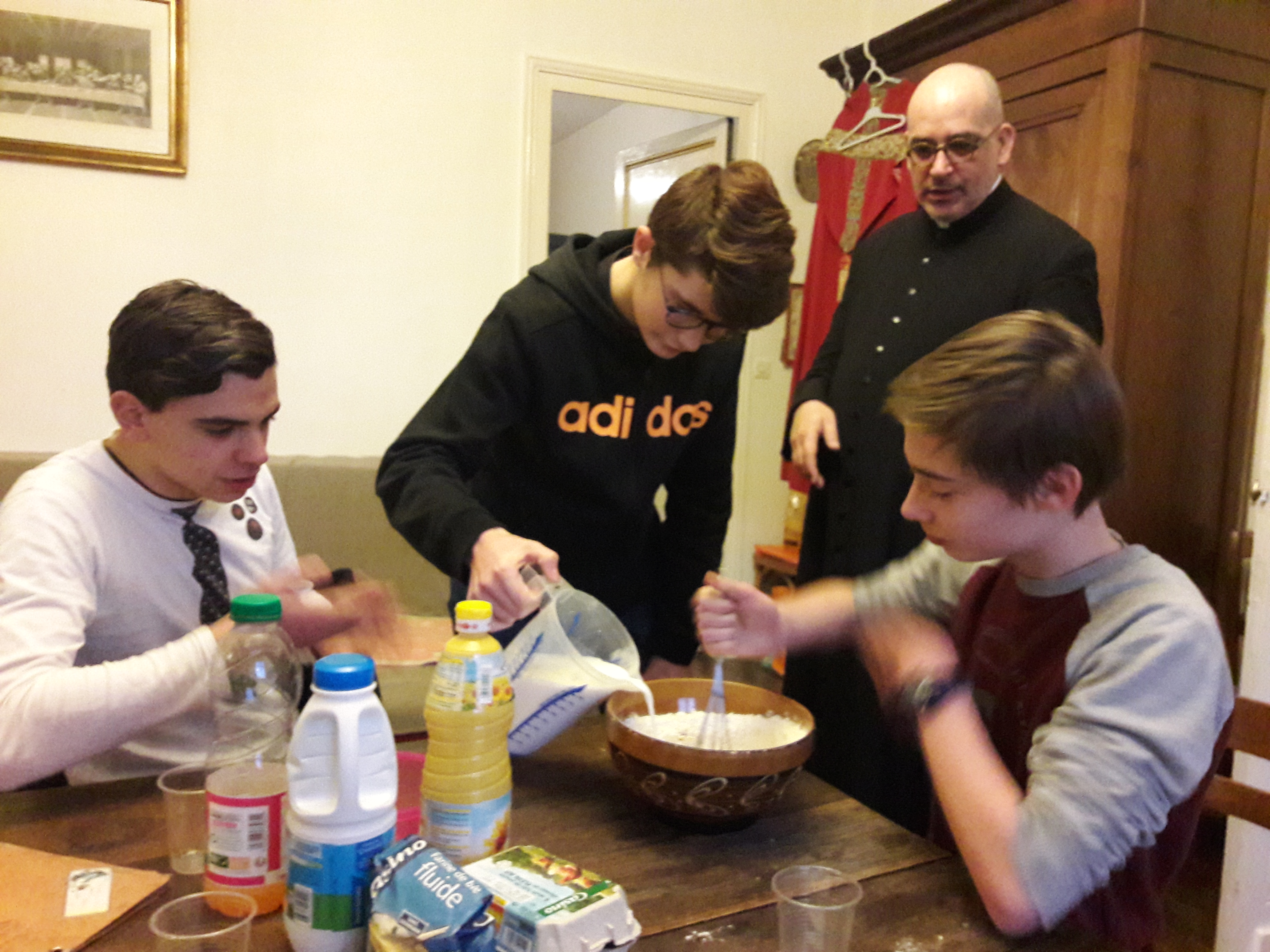 Ce vendredi 2 février, c’est après la messe de 17h00 que , ne dérogeant pas à la règle, le groupe d’aumônerie des 4ème/3ème, c’est lancé dans la confections des traditionnelles crêpes, sous la direction du père Christophe,