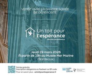 Et si, le temps d’une soirée, nous donnions ensemble de la hauteur à l’espérance ? Le Diocèse de Bordeaux vous invite à une grande soirée de générosité, au cœur du Musée Mer Marine, pour soutenir 8 projets au service de la culture, du patrimoine et de la mission. 300 personnes attendues Une soirée gratuite, …